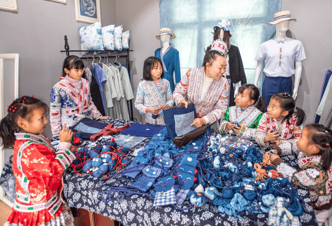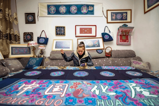 乌江的晨雾还未散尽,在化屋村自由组的安置房里,苗族绣娘杨艳手中的银针便在靛蓝的蜡染布上跳跃起来,在她身后,一幅“中国化屋”字样的蜡染刺绣作品挂在墙上。