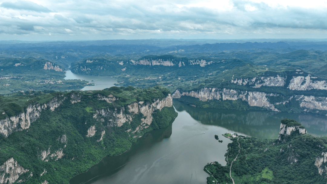 晨光熹微,乌江“第一湾”笼罩在薄雾中。波光粼粼的水面上,一叶扁舟轻轻划过,船桨荡起的涟漪在阳光下闪烁着金色光芒。